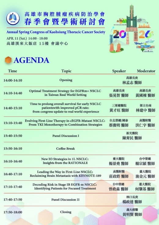 2026 Annual Spring Congress of Kaohsiung Thoracic Cancer Society 活動日期:115年04月11日(星期六) 14:00~18:00 活動地點:高雄漢來大飯店15F會議中心 主辦單位:高雄市胸腔腫瘤疾病防治學會